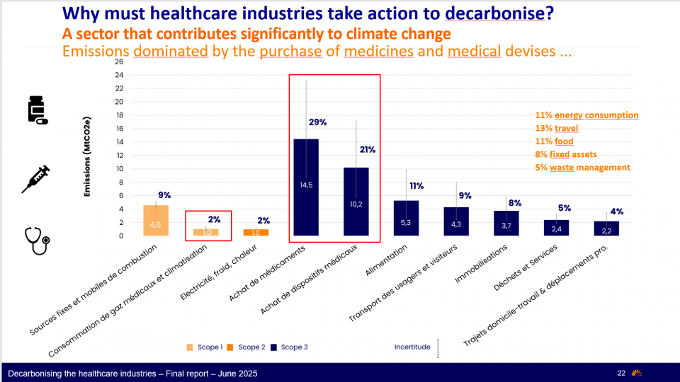 法国国立公共卫生学校的Marie Kernec分享数据指出,医疗行业占法国碳足迹总量的8%,其中药品与医疗设备相关排放占比高达50%。